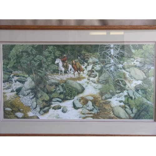 " THE FOREST HAS EYES "Bev Doolittle - 1984. 8544 Signed & Numbered Limited Edition Print 21.5" x 39" Email-price . A solitary mountain man guides his mount through the shallows of a stream. Leading a pack horse,he enters the territory of hostile Indians. A feeling of apprehension, a sense of foreboding, sweeps over him.