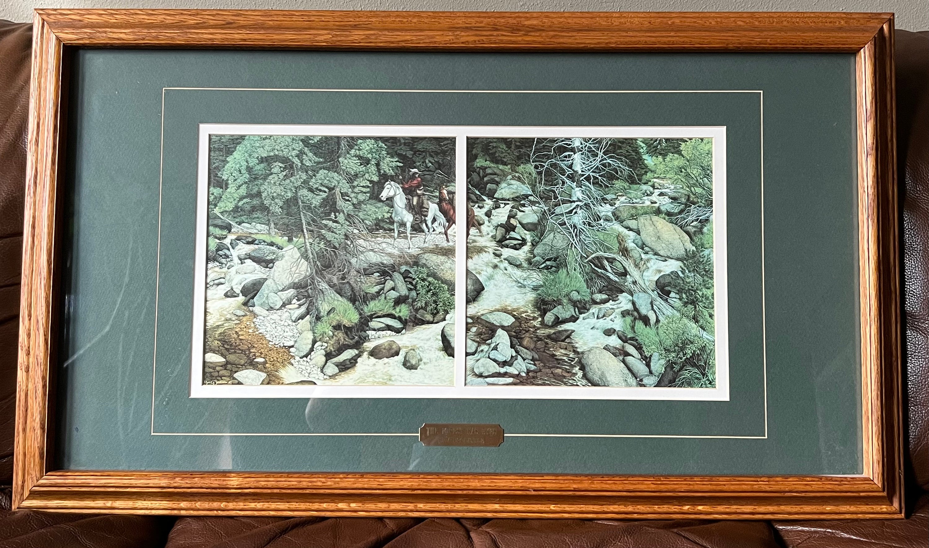 Another well-known work, "The Forest Has Eyes," portrays a rider on horseback followed by a packhorse as they cross a forest stream. Yet hidden among the rocks and trees are 13 native faces.