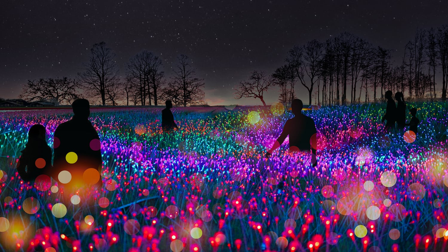 Prenez place dans les gradins pour une vue imprenable sur un immense champ peuplé de plus de 100 000 fleurs lumineuses qui prend vie au rythme de la musique et d'une narration inspirante du poète québécois Raôul Duguay.